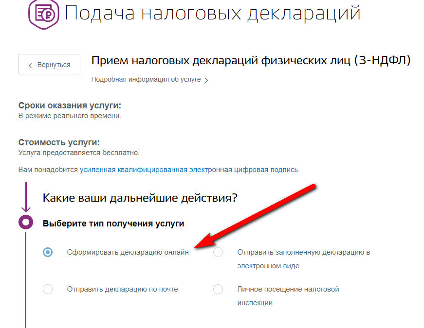 Там выбираем «Прием налоговых деклараций физических лиц (3-НДФЛ)» - услуга предоставляется в электронной форме. Откроется окно, в котором нужно выбрать тип получения услуги. Нам нужен тот, который позволяет заполнить декларацию онлайн. Затем жмем кнопку «Получить услугу»