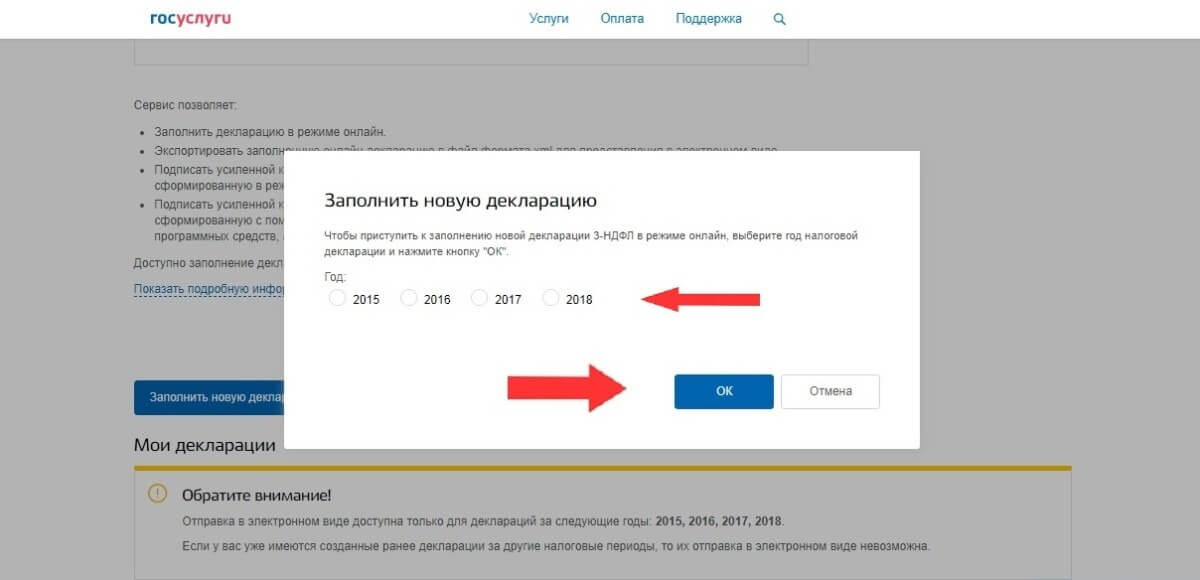 Нужно выбрать режим «Заполнить новую декларацию» и выбрать годы, за которые будут оформлена отчетность.