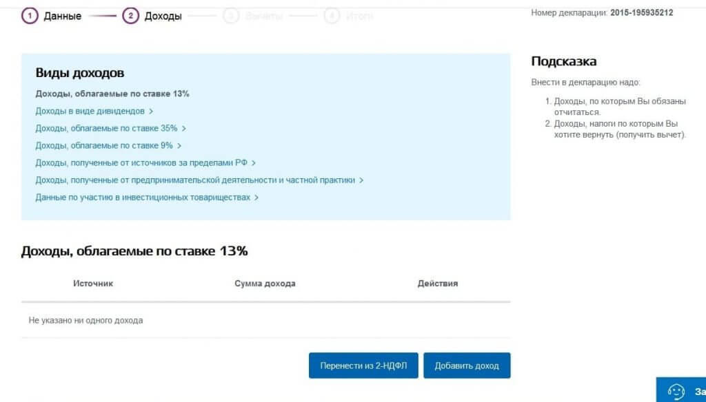 Сведения из профиля, которые вы внесли в личном кабинете, автоматически загрузятся из системы идентификации. Это ускорит сам процесс заполнения и поможет избежать ошибок. Останется заполнить только сведения о доходах и вычетах. Нажимает кнопку «Далее», попадаем на вкладку «Доходы».