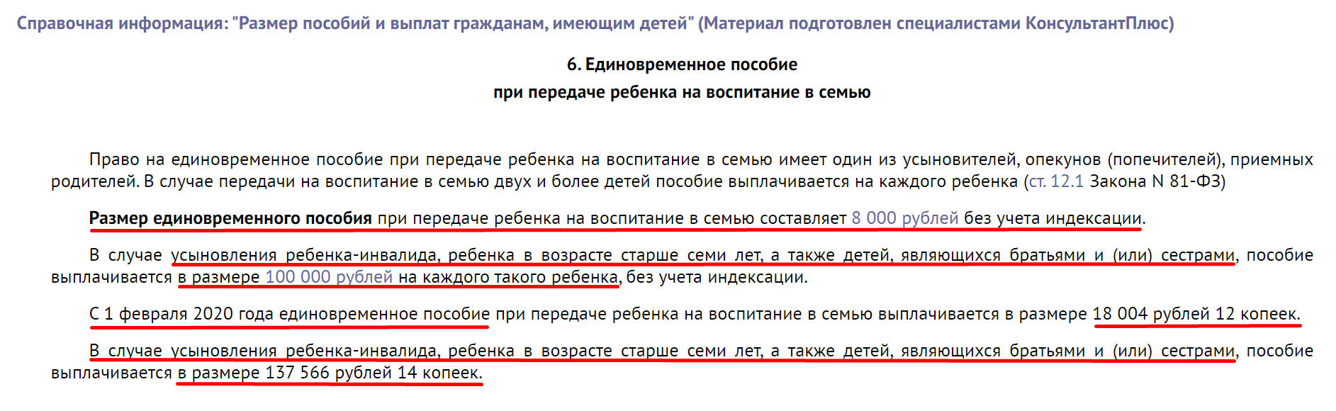 - Единовременное пособие при передаче ребенка в семью — 18 004 ₽. Но если вы усыновляете ребенка старше семи лет, братьев и сестер или ребенка с инвалидностью, то государство платит 137 566 ₽ на каждого.